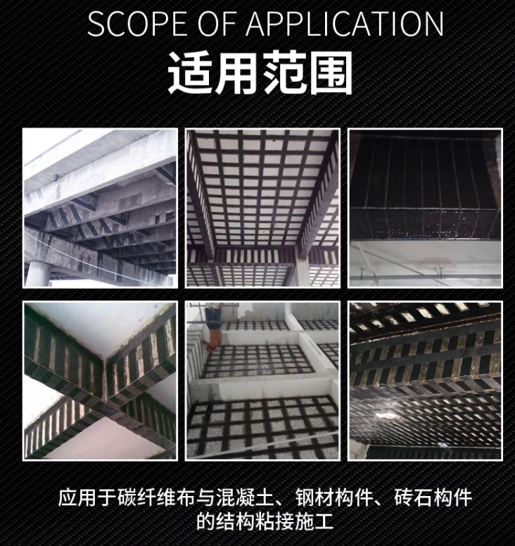 3、用于加(jia)固(gu)構(gou)件錶(biao)麵(mian)碳(tan)纖(xian)維、玻(bo)瓈(li)纖維及(ji)其牠纖維(wei)類片(pian)材的浸(jin)漬(zi)粘貼(tie)。